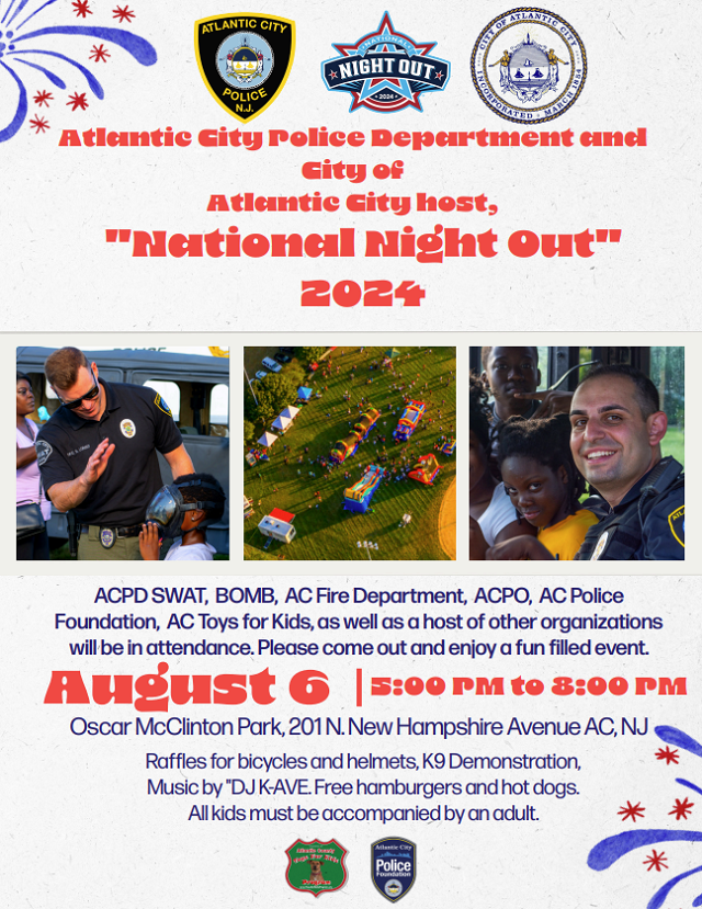 Posted August 02, 2024The City invites the entire Atlantic City community to National Night Out 2024 on Tuesday, August 6th from 5:00-8:00 PM at Oscar McClinton Park. National Night Out is a free event bringing Law Enforcement and the community together for an evening of fun, free food, police demonstrations and more!