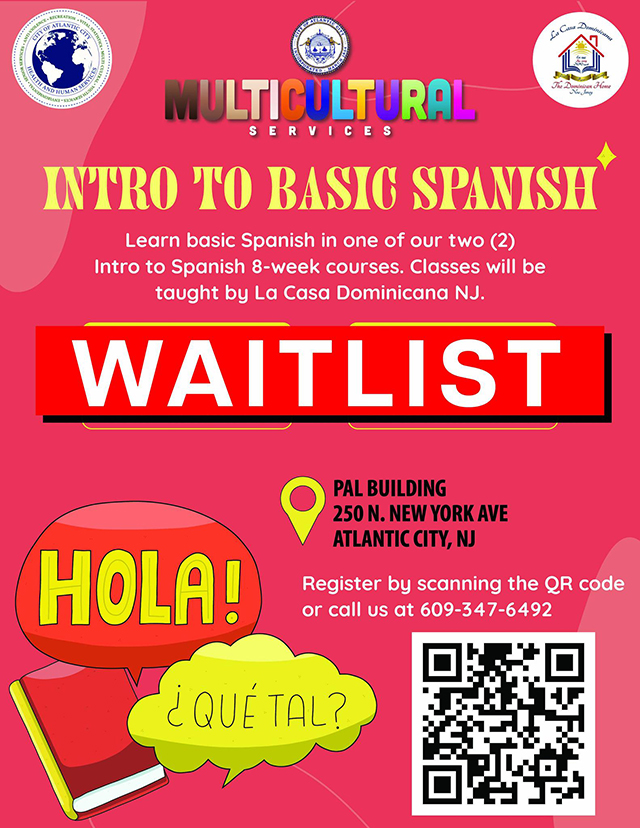Learn basic Spanish in one of our two (2) Intro to Spanish 8-week courses. Classes will be taught by La Casa Dominicana NJ at the PAL Building, 250 N. New York Ave., on Mondays from 10 to 11:30 a.m. and Wednesdays from 5 to 6:30 p.m.