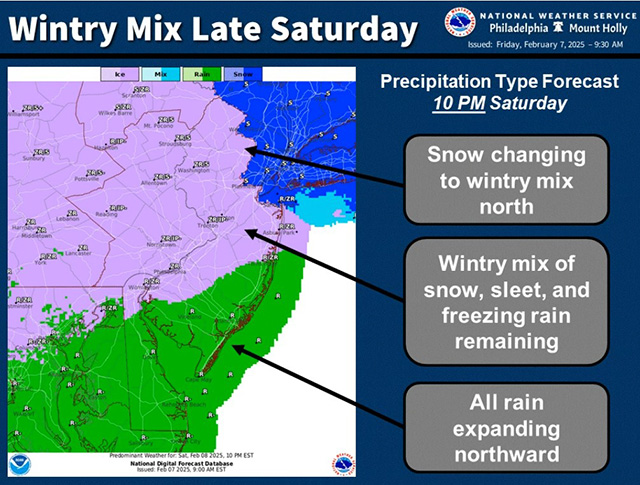 Posted February 07, 2025The Atlantic City Office of Emergency Management is advising of a possible wintry mix in our area Saturday into Sunday this weekend, as forecasted by the National Weather Service, who is warning of the potential of icy conditions during that time. Atlantic City OEM is also issuing a Code Blue during that same time, as well as from Sunday night to Tuesday morning.