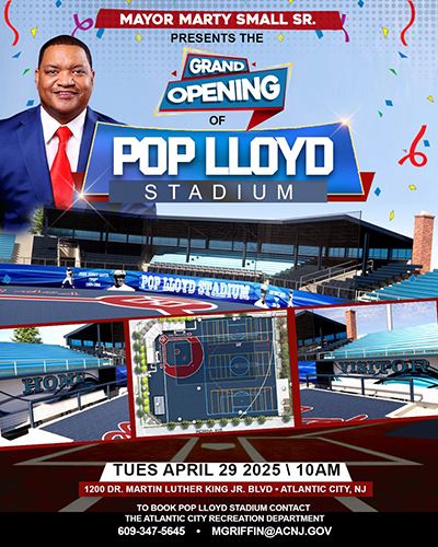 Posted April 25, 2025Mayor Small and city officials will officially cut the ribbon on Atlantic City’s iconic Pop Lloyd Stadium, which has undergone a complete renovation since last summer. No longer just a baseball field, the new Pop Llouyd stadium is now a multipurpose sports hub for other field sports like football, soccer and more. The field now features beautiful artificial blue turf plus brand-new dugouts, locker rooms, bleachers, restrooms, lighting and fencing.