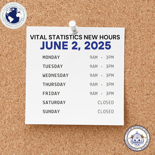 Posted May 28, 2025Starting June 2, 2025, the Atlantic City Vital Statistics Office will operate Monday through Friday from 9 AM to 3 PM. Please plan your visits accordingly, as the office will be closed on Saturdays and Sundays. Thank you for your cooperation!