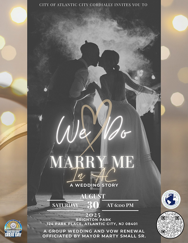 Posted July 11, 2025Get ready for the most romantic night of the summer! The City of Atlantic City invites 100 couples to join us for a FREE group wedding and vow renewal ceremony, officiated by Mayor Marty Small Sr. at the stunning Brighton Park.