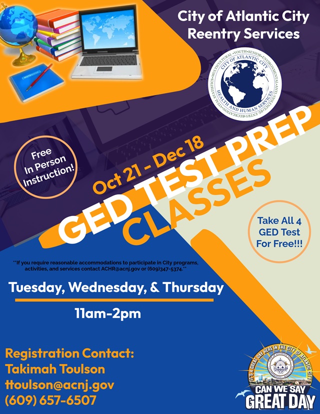 Posted October 10, 2025Join the City of Atlantic City Reentry Services for FREE in-person GED Test Prep Classes — starting October 21 through December 18!