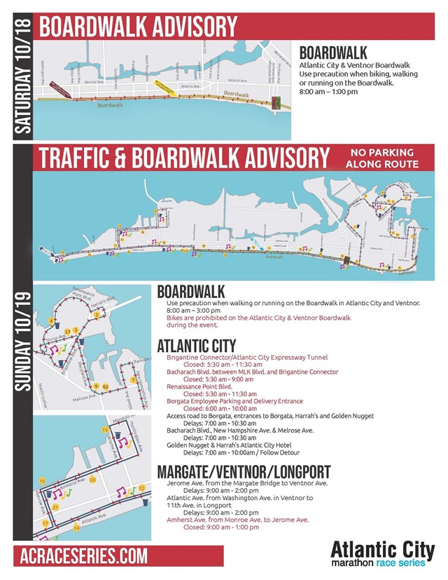 Motorists will see an influx of traffic on both days. Residents and visitors are urged to use caution when walking on the Boardwalk in Atlantic City and Ventnor. In addition, bicycles will be prohibited on the Boardwalk in Atlantic City and Ventnor Sunday from 8 am to 3pm.