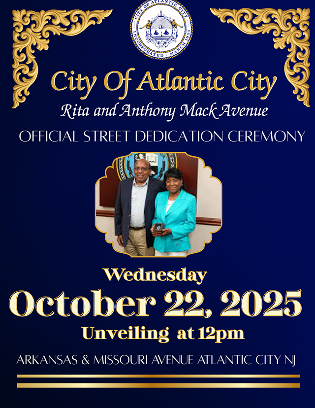 Please join Mayor Marty Small, Sr., members of City Council, community leaders and Atlantic City residents for a special ceremony on Wednesday, October 22, 2025 as Arctic Avenue between Michigan and Arkansas Avenues becomes “Rita and Anthony Mack Avenue.”