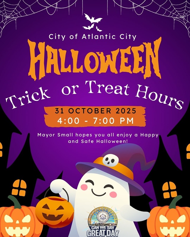 Posted October 28, 2025Get your costumes and candy buckets ready — Halloween is this Friday. Official trick-or-treat hours in Atlantic City are 4:00 to 7:00 PM on Halloween night (Oct. 31).