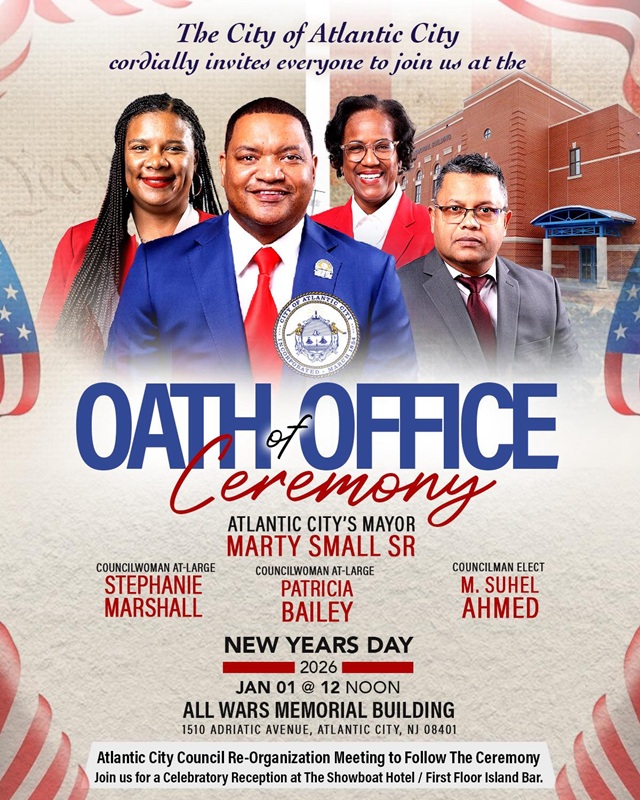 Posted December 30, 2025Following his reelection in November, Mayor Marty Small, Sr. will officially be sworn in to begin his next four-year term on New Year’s Day. The Oath of Office Ceremony will take place at Atlantic City’s All Wars Memorial Building (1510 Adriatic Avenue).
