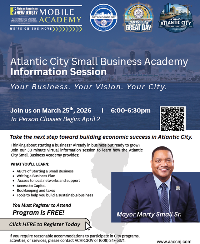 Posted March 24, 2026Mayor Small’s Small Business Academy for Atlantic City residents is returning in April. This is a free program offered by the City of Atlantic City designed to support residents who are interested in starting a business or growing an existing one. Participants gain valuable knowledge, resources, and guidance to help turn their ideas into successful businesses.